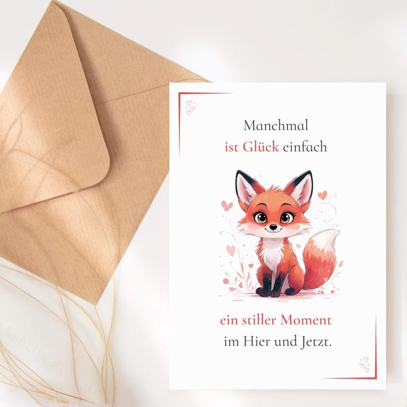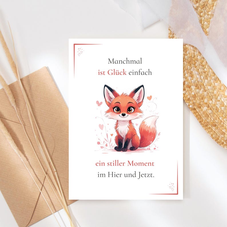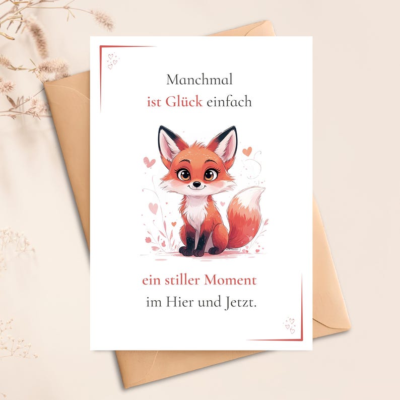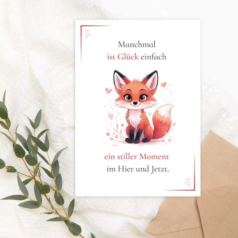 Diese liebevoll illustrierte Postkarte mit einem süßen Fuchs bringt Achtsamkeit und Wärme in deinen Alltag. Die Affirmation erinnert dich daran, dass Glück im Moment liegt – im Hier & Jetzt.